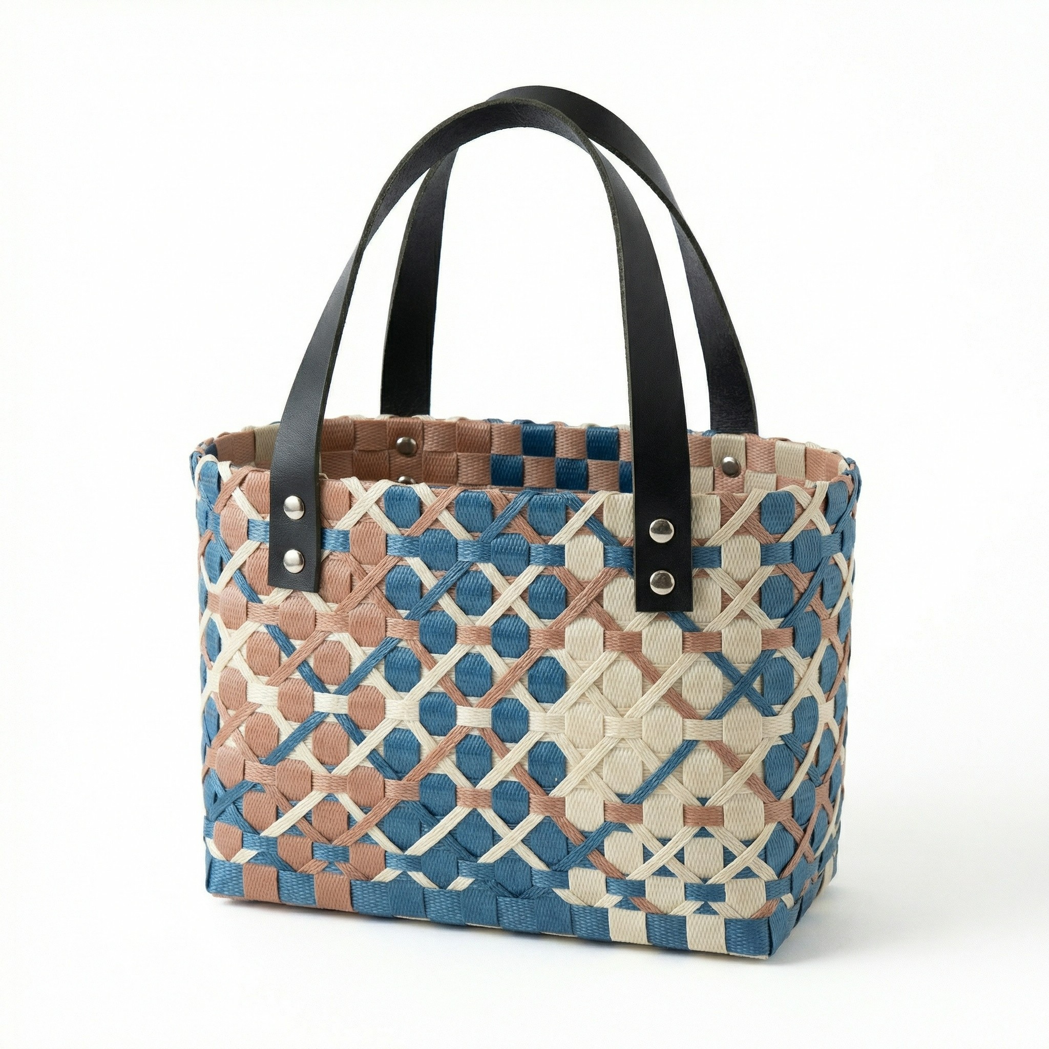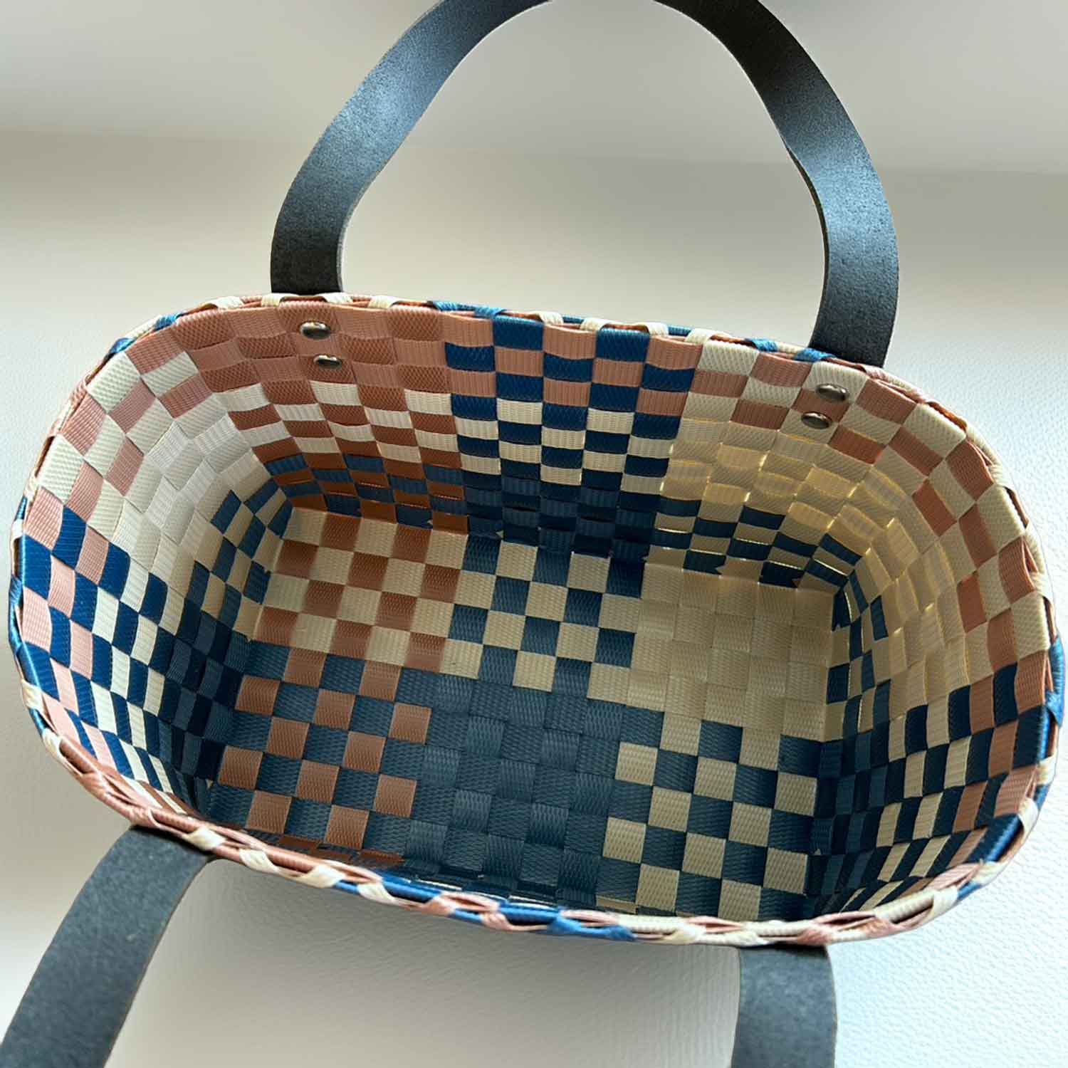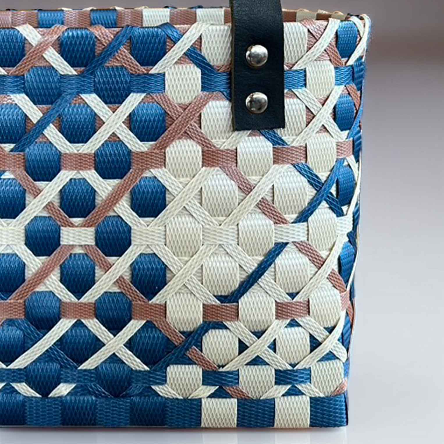PPバンドを使って、一つひとつ丁寧に編み上げたハンドメイドのプラカゴです。