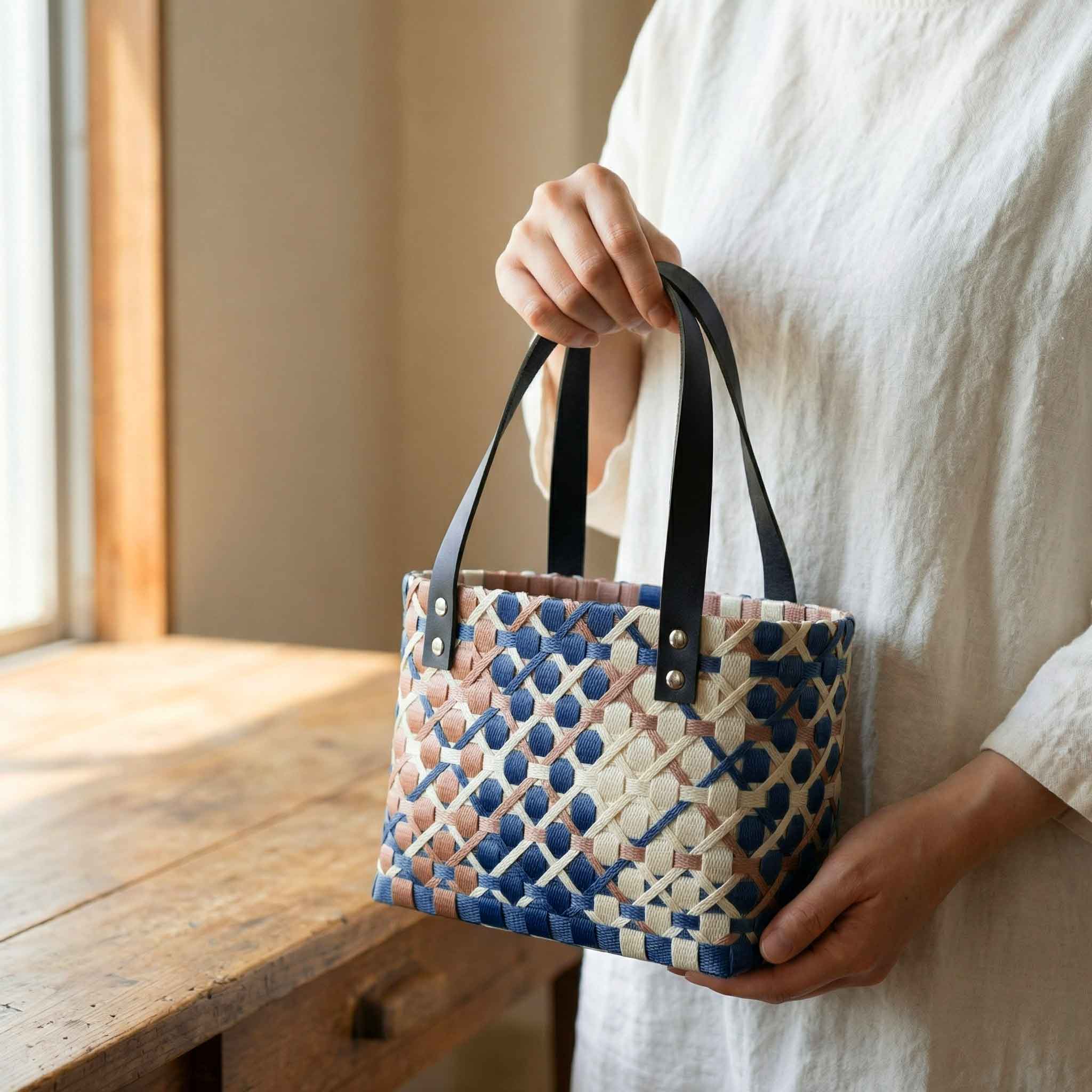 カゴの形や色合わせを楽しみながら、ひとつずつ丁寧に編んでいます。