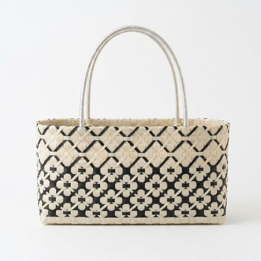 PPバンドのプラカゴ バッグ ベージュ 花柄 横 ハンドメイド -KOMUTEN こむてん-