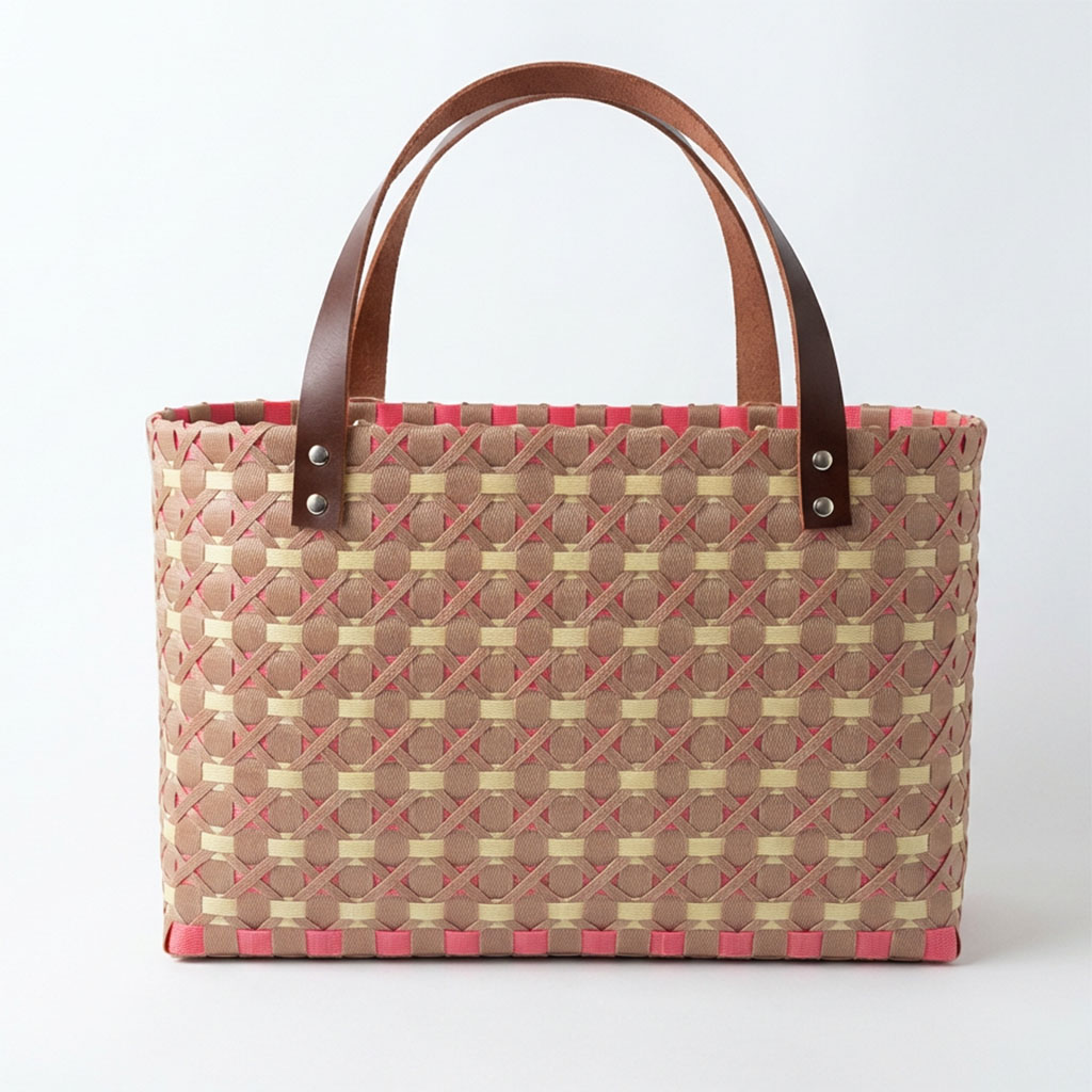 PPバンドのプラカゴ バッグ 茶色 ピンク 横長 ハンドメイド -KOMUTEN こむてん-
